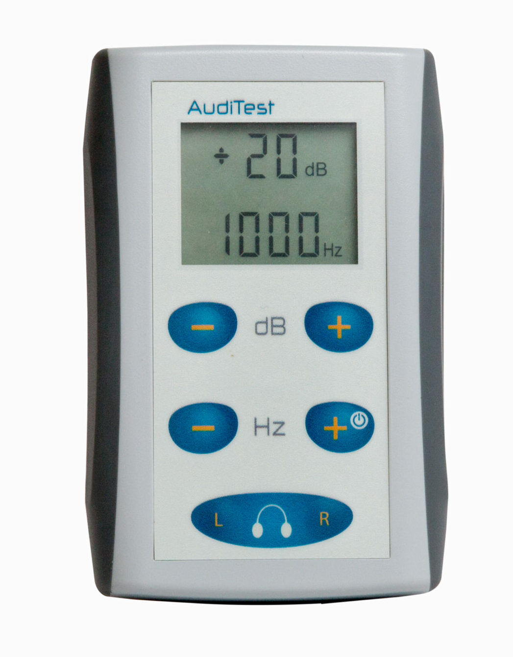 AudiTest Electronica (“Auditest”), audiomètre portable et manuel, conçu pour des dépistages auditifs adultes : 11 fréquences (125–8000 Hz), niveaux réglables de –10 à 100 dB, fonctionnement sur 2 piles AA, écran LCD clair et touches silencieuses, ergonomie d’une main, compatibilité CE 0459 et norme EN 60645‑1, conçu et fabriqué en France.