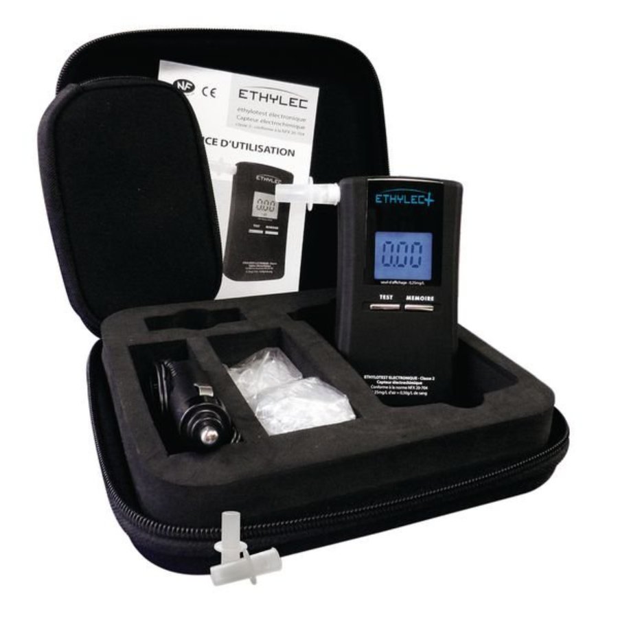 appareil de mesure numérique du taux d’alcoolémie par analyse de l’air expiré. Technologie électrochimique pour une lecture rapide et précise. Conforme aux normes NF EN 16280 et NF EN 15964, adapté à l’auto-test et usage professionnel